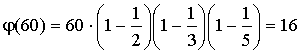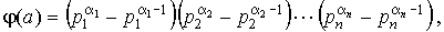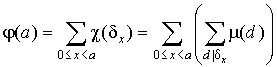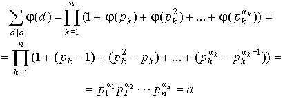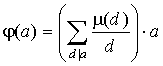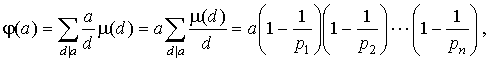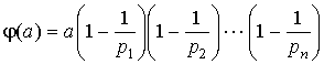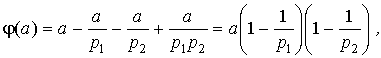 Воздержусь от доказательства этого следствия в силу банальности сего доказательства, но вот на правую часть этого тождества попрошу обратить внимание, так как она еще неоднократно у нас встретится. Физический смысл этой правой части раскрывает пример следующей функции. Пример 4. Функция Эйлера. Функция Эйлера, пожалуй, самая знаменитая и "дары приносящая" функция из всех функций, рассматриваемых в этом пункте. Функция Эйлера j ( a ) есть количество чисел из ряда 0, 1, 2,..., a - 1, взаимно простых с a . Полезность и практическое применение этой функции я продемонстрирую в следующих пунктах, а сейчас давайте поймем, как ее вычислять. ![]() Лемма 2. Пусть