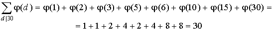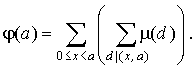 Поскольку справа сумма в скобках берется по всем делителям d числа d x = ( x , a ), то d делит x и d делит a . Значит в первой сумме справа в суммировании участвуют только те x , которые кратны d . Таких x среди чисел 0, 1, 2,..., a - 1 ровно a / d штук. Получается, что: