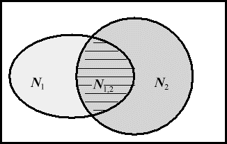 Рис. 4. Прямоугольник изображает множество всех целых чисел от 0 до a ; овал N 1 - множество чисел, кратных p 1 ; кружок N 2 - числа, кратные p 2 ; пересечение N 1,2 - множество чисел, делящихся одновременно на p 1 и p 2 , т.е. на p 1 p 2 ; числа вне овала и кружочка взаимно просты с a . Для подсчета числа чисел, взаимно простых с a , нужно из a вычесть количество чисел в N 1 и количество чисел в N 2 (их, соответственно, a / p 1 и a / p 2 штук), при этом общая часть N 1,2 (там a /( p 1 p 2 ) штук чисел) вычтется дважды, значит ее надо один раз прибавить (вот оно, "включение - исключение"!). В результате получим:
