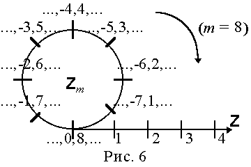 Запись этого факта выглядит так: Согласитесь, что вместо a є b(mod m) гораздо удобнее было бы писать что-нибудь вроде a є m b , но "привычка свыше нам дана, замена счастию она". ![]() Очевидно, что бинарное отношение сравнимости є m (неважно, по какому модулю) есть отношение эквивалентности на множестве целых чисел, а любители алгебры скажут, что это отношение является даже конгруэнцией кольца Z , фактор-кольцо по которой Z/ є m называется кольцом вычетов и обозначается Z m . Ясно, что число a сравнимо с b по модулю m тогда и только тогда, когда a-b делится на m нацело. Очевидно, это, в свою очередь, бывает тогда и только тогда, когда найдется такое целое число t , что a=b+mt . Знатоки алгебры добавят к этим эквивалентным утверждениям, что сравнимость a с b по модулю m означает, что a и b представляют один и тот же элемент в кольце Z m . В далекие дни моей бурной молодости понять процесс собирания целых чисел в классы сравнимых между собой по модулю m (классы эквивалентности є m ) мне помогла следующая картинка: