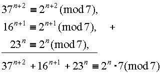 т.е. 37 n+2 +16 n+1 +23 n делится на 7 . Как видите, ровным счетом ничего сложного в решении подобных школьных задач "повышенной трудности" нет. С удовольствием заканчиваю настоящий пункт, чтобы устремиться к следующему, то есть устремиться из прошлого в будущее.