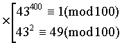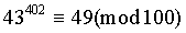 Возведем эти сравнения в куб и сложим: 1 18 +2 18 +3 18 +4 18 +5 18 +6 18 є 6(mod 7) є -1(mod 7) Пример 3. Найти остаток от деления 7 402 на 101 . Решение. Число 101 – простое, (7, 101)=1, следовательно, по теореме Ферма: 7 100 є 1(mod 101). Возведем это сравнение в четвертую степень: 7 400 є 1(mod 101), домножим его на очевидное сравнение 7 2 є 49(mod 101), получим: 7 402 є 49(mod 101). Значит, остаток от деления 7 402 на 101 равен 49. Пример 4. Найти две последние цифры числа 243 402 . Решение. Две последние цифры этого числа суть остаток от деления его на 100. Имеем: 243=200+43; 200+43 є 43(mod 100) и, возведя последнее очевидное сравнение в 402-ую степень, раскроем его левую часть по биному Ньютона (мысленно, конечно). В этом гигантском выражении все слагаемые, кроме последнего, содержат степень числа 200, т.е. делятся на 100, поэтому их можно выкинуть из сравнения, после чего понятно, почему 243 402 є 43 402 (mod 100). Далее, 43 и 100 взаимно просты, значит, по теореме Эйлера, 43 j (100) є 1(mod 100). Считаем: j (100)= j (2 2 Ч 5 2 )=(10–5)(10–2)=40. Имеем сравнение: 43 40 є 1(mod 100), которое немедленно возведем в десятую степень и умножим почленно на очевидное сравнение, проверенное на калькуляторе: 43 2 є 49(mod 100). Получим: