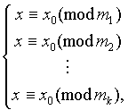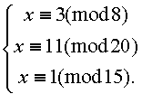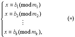 На этом пункт 19 можно было бы и закончить, но невозможно, говоря о решении сравнений первой степени, обойти стороной вопрос о решении систем сравнений первой степени. Дело в том, что умение решать простейшие системы сравнений не только является неотъемлемой частью общечеловеческой культуры, позволяющей гражданину не падать в ямы, расщелины и открытые люки. Такое умение, кроме всего прочего, пригодится нам при изучении сравнений произвольной степени, о которых пойдет речь в следующих пунктах. Лемма 1 (Китайская теорема об остатках). Пусть дана простейшая система сравнений первой степени: