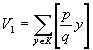 Рассмотрим два множества: Образуем ( p -1)/2 Ч ( q -1)/2 штук пар чисел ( qx,py ), где х пробегает S , a y пробегает К . Первая и вторая компонента одной пары никогда не совпадают, ибо из py = qx следует, что py кратно q . Но ведь это невозможно, так как ( p,q )=1 и, поскольку 0< y < q , то ( y , q )=1. Положим, поэтому, ( p -1)/2 Ч ( q -1)/2= V 1 + V 2 , где V 1 – число пар, в которых первая компонента меньше второй ( qx < py ), V 2 – число пар, в которых вторая компонента меньше первой ( qx > py ). Очевидно, что V 1 есть число пар, в которых x < ( p / q ) y . (Вообще-то, x Ј ( p -1)/2, но ( p / q ) y < p /2 т.к. y/q < 1/2 , следовательно [( p / q ) y ] Ј [ p/ 2]= ( p -1)/2, и неравенство x <( p / q ) y не противоречит неравенству x Ј ( p -1)/2.) Поэтому,