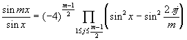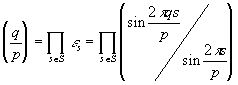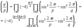 Доказательство получается непосредственной проверкой. Например, по формуле Муавра, убеждаемся, что левая часть есть полином степени ( m -1)/2 от sin 2 x , корни которого есть sin 2 (2 p j/m ), где 1 Ј j Ј ( m -1)/2. Множитель (-4) ( m -1)/2 получается сравнением коэффициентов в левой и правой частях. Доказательство закона взаимности. Пусть р и