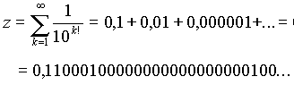 - в десятичной дроби единички стоят на месте с номером k!, остальные позиции заняты нулями. Число z иррационально, т.к. данная десятичная дробь не периодическая ( Действительно, пусть ее период имеет длину а . Он должен содержать хоть одну единичку, но в записи этой дроби есть промежутки, состоящие из а нулей подряд.) Пусть nОN. Возьмем