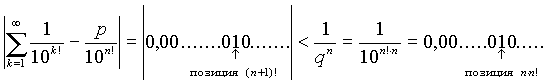 Очевидно, что это верно при |z - p/q|>1, т.к. Mі1, qі1. Пусть |z - p/q|Ј1. Тогда |f(p/q)|ЈMЧ|z - p/q|. Умножим полученное неравенство на qn: |qnf(p/q)|ЈMЧqnЧ|z - p/q|. Ясно, что уравнение f(x)=0 не имеет рациональных корней, иначе число z имело бы меньшую степень (многочлен f(x) разложился бы на множители, один из которых суть (x - p/q), а иррациональное z оказалось бы корнем второго множителя меньшей степени). Таким образом, f(p/q)№0, а qnf(p/q) – целое и не равное нулю число. Значит, |qnf(p/q)|і1, следовательно, 1ЈMЧqnЧ|z - p/q| т.е. |z - p/q|і 1/Mqn. Равенство невозможно, так как z иррационально. Ё Трудно объяснить, но меня почему-то приводит в восхищение последняя фраза из доказательства леммы Лиувилля: "Равенство невозможно, так как z иррационально" - кратко, просто и неоспоримо. Сказал - как отрезал. Кроме того, к моменту произнесения этой фразы читатели уже наверняка забыли (во всяком случае, студенты на лекции напрочь забывают), что нужно доказывать строгое неравенство, поэтому "нежданной шуткой огорошить" вдвойне приятно. В параграфе 2, посвященном цепным дробям, мы немножечко поговорили о приближении действительных чисел рациональными дробями, отметив, в частности, что подходящая дробь - наилучшее приближение данного числа среди всех дробей, знаменатели которых не превосходят знаменатель подходящей дроби. Лемма Лиувилля тоже, фактически, относится к теории приближения действительных чисел рациональными, так как она говорит нам, что алгебраические числа весьма плохо приближаются рациональными дробями с заданным знаменателем. Возникает мысль, что именно этим своим свойством алгебраические числа вполне могут отличаться (и отличаться разительно) от других иррациональных чисел, если, конечно, таковые существуют. Идея, ударившая Лиувилля, как раз и заключалась в том, чтобы рассмотреть утверждение леммы как отличительное характеристическое свойство алгебраических иррациональностей. После этой простой, но сильной мысли, Лиувиллю для изобретения трансцендентных чисел оставалось совсем немного - придумать иррациональное число, которое очень хорошо приближается рациональными дробями, и проверить, что такое число обязано быть трансцендентным. Определение 3. Действительное число z называется числом Лиувилля, если z иррационально и для каждого натурального n существуют целые p и q такие, что q>1 и |z - p/q|<. ![]() Пример 1 (с помощью ряда). Рассмотрим число