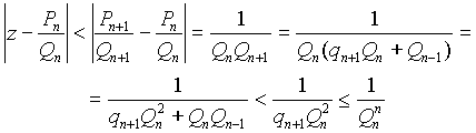 где последовательность неполных частных q1<q2<...<qs<... возрастает так, что qs+1іQss-2 (Qs – знаменатель s-ой подходящей дроби числа z ). Тогда для произвольного натурального n возьмем в определении чисел Лиувилля p=Pn, q=Qn и вспомним свойства подходящих дробей: