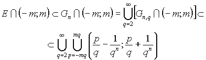 - нуль-множество. Ё Теорема 3, дорогие читатели, как раз и дает обещанный в предыдущем пункте конкретный пример разбиения числовой прямой на два множества R=EИE', первое из которых - меры нуль но второй категории, а второе - первой категории. Не перепутайте первую со вторым, а второе с первым. Считаю краткую экскурсию в мир чисел Лиувилля законченой.