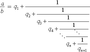 Все неполные частные в ней, начиная со второго, равны двойке. Очевидно, что если a О R - иррационально, то описанный выше процесс бесконечен, так как иначе, в случае остановки этого процесса, a оказалось бы равным конечной цепной дроби, т.е. рациональному числу. Значит, всякое иррациональное число если и можно, то можно представить только бесконечной цепной дробью. Забудем пока про иррациональные числа и окунемся в приятный мир рациональных. Пусть a О Q , a = a / b ; a , b О Z , b > 0. Оказывается, что при этих условиях, указанный выше процесс разложения числа в цепную дробь всегда конечен и выполним с помощью достопочтенного и любимого нами алгоритма Евклида. Действительно, отдадим алгоритму числа a и b , и внимательно посмотрим, что получится.